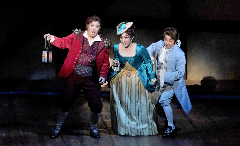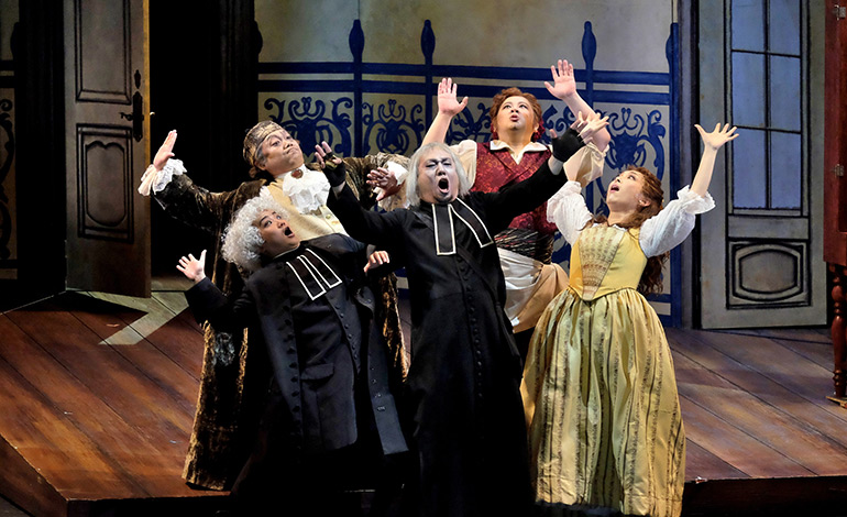 2人の結婚が成立した頃、バルトロが兵士を連れて現れますが、後の祭り。悔しがるバルトロを前に、伯爵がロジーナの持参金は必要ないと宣言したため、バルトロは怒りを鎮めます。幸せな結末を迎えて、幕が閉じます。